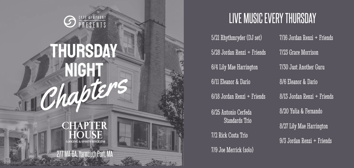 Join Cape Symphony Presents for Thursday Night Chapters - a free, weekly summer residency at the historic Chapter House in Yarmouth Port. Running from May 21 through September 3, this concert series transforms Thursday evenings into a vibrant celebration of live music, community, and Cape Cod culture. Set at of one of the Cape’s most unique and intimate venues, Thursday Night Chapters invites you to unwind, connect, and experience incredible performances under the stars.